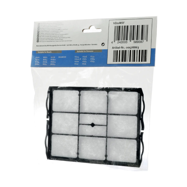 פילטר הגנת המנוע 00578863 הוא פילטר רשת שטוח הממוקם בין שק האבק למנוע השואב. הוא לוכד חלקיקי אבק עדינים שעוברים דרך שק האבק ומונע אותם מלהגיע למנוע. פילטר תקין שומר על עוצמת שאיבה מלאה ומאריך את חיי המנוע. ניתן לשטיפה ולשימוש חוזר, אך מומלץ להחליפו לחלוטין פעמיים בשנה.