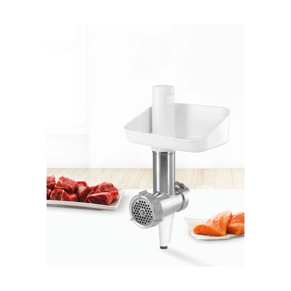 מטחנת הבשר MUZ5FW1 היא אביזר מקורי בוש לסדרת מיקסרים MUM5. היא מתחברת ישירות למיקסר ומאפשרת טחינת בשר טרי בבית. הסט כולל דיסקית מחוררת מנירוסטה (4.5 מ”מ), להב, מגש מילוי וצינור הזנה. כל חלקי המגע עם המזון עשויים פלסטיק קשיח ללא BPA.